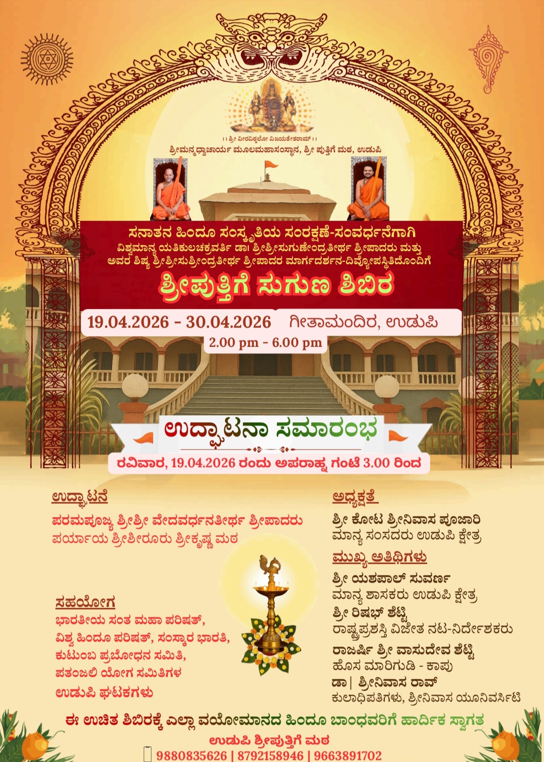 ಉಡುಪಿ :ಶ್ರೀಮನ್ ಮಧ್ವಾಚಾರ್ಯ ಮೂಲ ಮಹಾಸಂಸ್ಥಾನ ಶ್ರೀ ಪುತ್ತಿಗೆ ಮಠದ ವಿಶ್ವಮಾನ್ಯ ಯತಿಕುಲ ಚಕ್ರವರ್ತಿ ಶ್ರೀಶ್ರೀ ಸುಗುಣೇಂದ್ರತೀರ್ಥ ಶ್ರೀಪಾದರು ಮತ್ತವರ ಶಿಷ್ಯ ಶ್ರೀಶ್ರೀ ಸುಶ್ರೀಂದ್ರತೀರ್ಥ ಶ್ರೀಪಾದಂಗಳವರ ಮಾರ್ಗದರ್ಶನ ಮತ್ತು ದಿವ್ಯ ಉಪಸ್ಥಿತಿಯಲ್ಲಿ ಸಮಸ್ತ ಹಿಂದೂ ಬಾಂಧವರಿಗಾಗಿ ಉಡುಪಿ ಗೀತಾಮಂದಿರದಲ್ಲಿ ಶ್ರೀಪುತ್ತಿಗೆ ಸುಗುಣ ಶಿಬಿರವನ್ನು ಮೊಟ್ಟಮೊದಲ ಬಾರಿಗೆ ಆಯೋಜಿಸಲಾಗುತ್ತಿದೆ ಎಂದು ಶ್ರೀಮಠದ ಪ್ರಕಟಣೆ ತಿಳಿಸಿದೆ. ಏಪ್ರಿಲ್ 19ರಂದು ಅಪರಾಹ್ನ 3 ಗಂಟೆಯಿಂದ ಉದ್ಘಾಟನಾ ಸಮಾರಂಭ ನಡೆಯಲಿದ್ದು ಶ್ರೀಪಾದದ್ವಯರ ದಿವ್ಯ ಉಪಸ್ಥಿತಿಯಲ್ಲಿ, ಪರ್ಯಾಯ ಶ್ರೀಶೀರೂರು ಶ್ರೀಕೃಷ್ಣ ಮಠದ ಶ್ರೀಶ್ರೀ ವೇದವರ್ಧನತೀರ್ಥ ಶ್ರೀಪಾದರು ಉದ್ಘಾಟನೆಗೈಯಲ್ಲಿದ್ದಾರೆ. ಉಡುಪಿ ಕ್ಷೇತ್ರದ ಸಂಸದ ಕೋಟ ಶ್ರೀನಿವಾಸ್ ಪೂಜಾರಿ ಅಧ್ಯಕ್ಷತೆ ವಹಿಸಲಿದ್ದು, ಮುಖ್ಯ ಅತಿಥಿಗಳಾಗಿ ಶಾಸಕ ಯಶಪಾಲ್ ಸುವರ್ಣ, ರಾಷ್ಟ್ರ ಪ್ರಶಸ್ತಿ ವಿಜೇತ ನಟ-ನಿರ್ದೇಶಕ ರಿಷಭ್ ಶೆಟ್ಟಿ, ಕಾಪು ಹೊಸ ಮಾರಿಗುಡಿ ಕ್ಷೇತ್ರದ ರಾಜರ್ಷಿ ವಾಸುದೇವ ಶೆಟ್ಟಿ ಮತ್ತು ಮಂಗಳೂರು ಶ್ರೀನಿವಾಸ ಯುನಿವರ್ಸಿಟಿಯ ಕುಲಾಧಿಪತಿ ಡಾ। ಶ್ರೀನಿವಾಸ ರಾವ್ ಭಾಗವಹಿಸಲಿದ್ದಾರೆ. ಸಮಗ್ರ ಶಿಬಿರಕ್ಕೆ ಭಾರತೀಯ ಸಂತ ಮಹಾಪರಿಷತ್, ವಿಶ್ವಹಿಂದೂ ಪರಿಷತ್, ಸಂಸ್ಕಾರ ಭಾರತಿ, ಕುಟುಂಬ ಪ್ರಬೋಧನ ಸಮಿತಿ ಮತ್ತು ಪತಂಜಲಿ ಯೋಗ ಸಮಿತಿಗಳ ಉಡುಪಿ ಘಟಕಗಳು ಸಹಯೋಗ ನೀಡಲಿವೆ. ಏಪ್ರಿಲ್ 20ರಿಂದ ಏಪ್ರಿಲ್ 30ರವರೆಗೆ ಪ್ರತಿದಿನ ಅಪರಾಹ್ನ 2.00ರಿಂದ ಸಂಜೆ 5.30ರವರೆಗೆ ನಡೆಯಲಿರುವ ಈ ಶಿಬಿರದಲ್ಲಿ 5 ವರ್ಷ ವಯೋಮಿತಿಯಿಂದ 60 ವರ್ಷ ಮೇಲ್ಪಟ್ಟವರೆಗೂ ಐದು ವಿಭಾಗಗಳಲ್ಲಿ ತರಗತಿಗಳನ್ನು ನಡೆಸಲಾಗುತ್ತದೆ. ಸರಳ ನಿತ್ಯ-ವಿಧಿಗಳು, ಹಿಂದೂ ಆಚಾರ-ವಿಚಾರಗಳು, ಹಾಡು, ಭಜನೆ, ಕಲೆ, ಹೂ ಕಟ್ಟುವುದು, ರಂಗವಲ್ಲಿ, ವಿವಿಧ ಆಟಗಳು, ಕರ-ಕುಶಲ, ಹಬ್ಬ-ಹರಿದಿನಗಳ ಮಾಹಿತಿ, ಉಪನ್ಯಾಸಗಳು ಹಾಗೂ ಸಾಧಕ-ಸಂವಾದ ವಿಭಾಗಗಳಲ್ಲಿ ತರಬೇತಿ ನೀಡಲಾಗುತ್ತದೆ. ಯಾವುದೇ ವಯೋಮಾನದ ಹಿಂದೂ ಬಾಂಧವರು ಶಿಬಿರದಲ್ಲಿ ಪಾಲ್ಗೊಳ್ಳಬಹುದಾಗಿದೆ ಎಂಬುದಾಗಿ ಶಿಬಿರ ಸಮಿತಿ ಮತ್ತು ಶ್ರೀಮಠದ ಪ್ರಕಟಣೆ ತಿಳಿಸಿದೆ.
