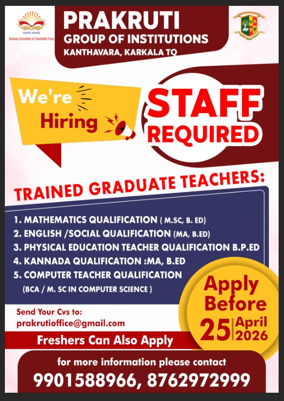ಕಾರ್ಕಳ :ಏಪ್ರಿಲ್ 21:ಕಾರ್ಕಳ ತಾಲೂಕು ಕಂಠಾವರದಲ್ಲಿರುವ ಪ್ರಕೃತಿ ಗ್ರೂಪ್ ಆಫ್ ಇನ್ಸ್ಟಿಟ್ಯೂಷನ್ಸ್ನಲ್ಲಿ ವಿವಿಧ ಶಿಕ್ಷಕ ಹುದ್ದೆಗಳಿಗೆ ಅರ್ಜಿ ಆಹ್ವಾನಿಸಲಾಗಿದೆ.