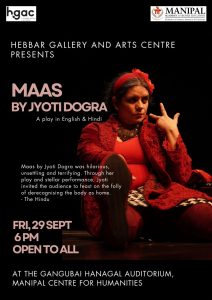 ಖ್ಯಾತ ನಟ ಜ್ಯೋತಿ ಡೋಗ್ರಾ ಅವರು ತಮ್ಮ ಏಕ ಮಹಿಳೆ ನಾಟಕ “ಮಾಸ್” ಅನ್ನು ಶುಕ್ರವಾರ, ಸೆಪ್ಟೆಂಬರ್ 29, 2023 ರಂದು ಸಂಜೆ 6:00 ಗಂಟೆಗೆ ಪ್ರದರ್ಶಿಸಲಿದ್ದಾರೆ. ಮಣಿಪಾಲ ಸೆಂಟರ್ ಫಾರ್ ಹ್ಯುಮಾನಿಟೀಸ್ನ ಸುಂದರವಾದ ಪರಿಮಿತಿಯಲ್ಲಿರುವ ಗಂಗೂಬಾಯಿ ಹಾನಗಲ್ ಆಡಿಟೋರಿಯಂನಲ್ಲಿ ಪ್ರದರ್ಶನ ನಡೆಯಲಿದೆ.