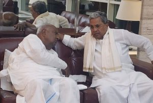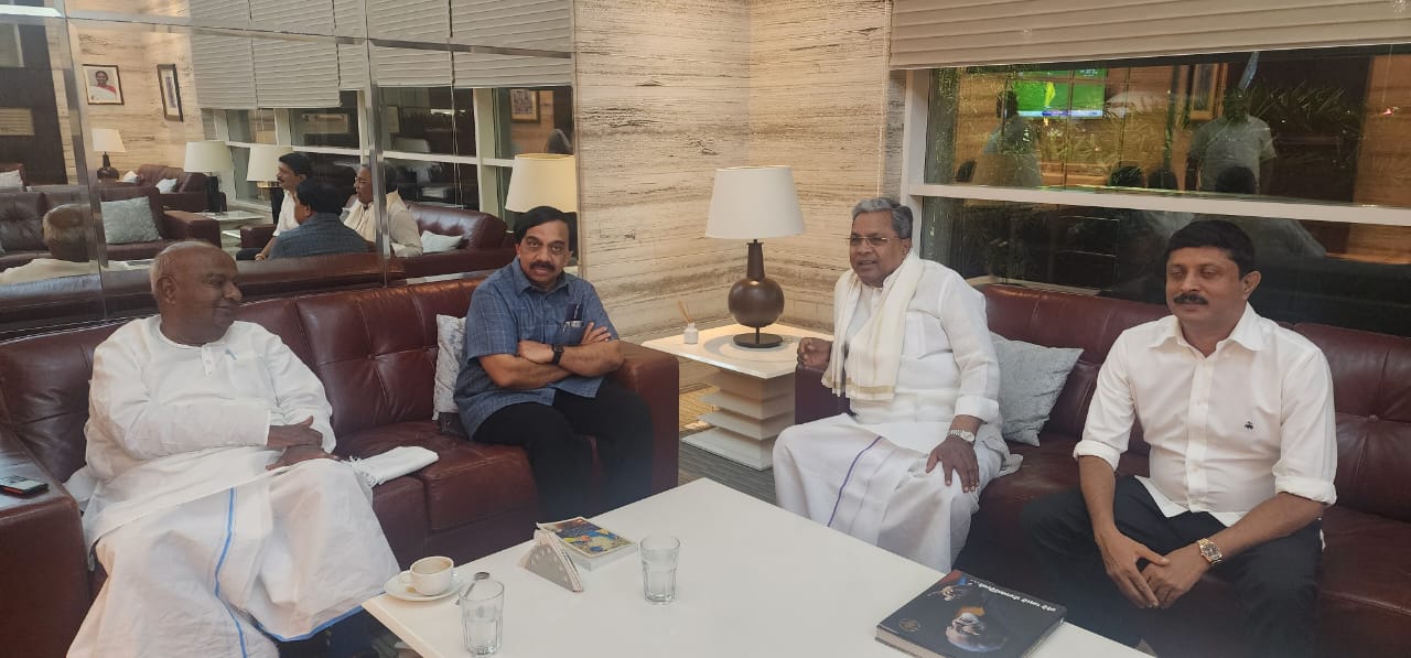 CWC ಸಭೆಯಲ್ಲಿ ಪಾಲ್ಗೊಳ್ಳಲು ದೆಹಲಿಗೆ ತೆರಳಲು ಕೆಂಪೇಗೌಡ ಅಂತಾರಾಷ್ಟ್ರೀಯ ವಿಮಾನ ನಿಲ್ದಾಣಕ್ಕೆ ಆಗಮಿಸಿದ ಮುಖ್ಯಮಂತ್ರಿ ಸಿದ್ದರಾಮಯ್ಯ ಅವರಿಗೆ , ಮಂಗಳೂರಿಗೆ ತೆರಳಲು ಆಗಮಿಸಿದ್ದ ಮಾಜಿ ಪ್ರಧಾನಿ ದೇವೇಗೌಡರು ಮತ್ತು ಇವರ ಧರ್ಮಪತ್ನಿ ಚನ್ನಮ್ಮ ಅವರು ಅನಿರೀಕ್ಷಿತವಾಗಿ ಮುಖಾಮುಖಿಯಾದರು.